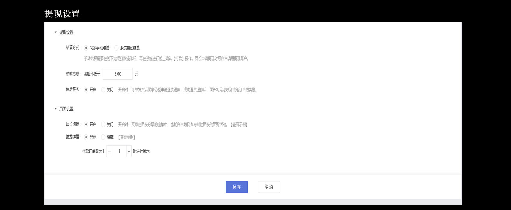 - 审核设置:目前默认所有会员可申请(即将支持开启“指定会员等级申请”),把控团长的质量。