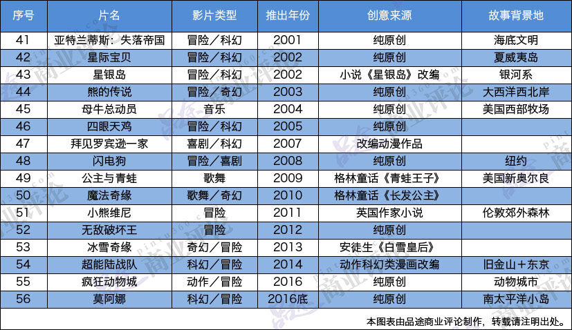 品途商业评论统计了迪斯尼自1937年以来所制作出品的所有长篇动画电影,让我们先来看看迪斯尼的那些超级IP都从哪儿来: