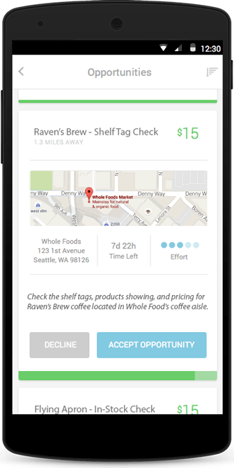 Observa每天会通过自己的App应用,提醒购物者去检查指定商品是否摆放在指定的商店货架位置上。这些用户会拍摄商店货架的照片,然后根据自己看到的情况回答一些提问。每次店内商品位置检查工作,Observa用户最多可以得到15美元的报酬。之后,Observa会将收集到的相关数据信息汇总成一份报告,发送给品牌商(比如Craft Brew Alliance和Raven’s Brew Coffe)。