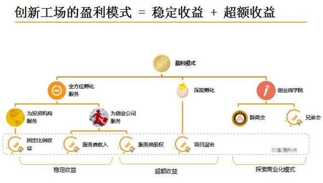 创新工场孵化器的盈利模式是稳定收益+超额收益,具体而言,分为全方面孵化服务、深度孵化服务、创业商学院(群英会、兄弟会)。