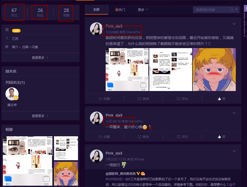 而且,你看,本身发的状态就没有留言,而我们到她主页去看了,是刚开始玩微博的,所以,这时候,如果我们去留言,并且有些好的互动的话,引入到微信公众号及私人号是很轻松的。而且你不用担心她是微商,会刷屏,因为人家不是网红。通过微博分享的内容就知道,人家是一个地地道道的文艺小青年。
