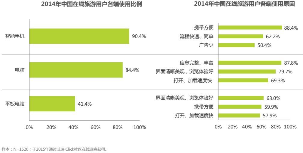 见上图,据艾瑞网统计显示,2014年中国在线旅游用户移动端使用比例已明显超越PC端,而用户选择移动端的原因主要集中在携带方便和流程快速简单,这对于旅游攻略类产品来说具有十分重要的指导性意义。