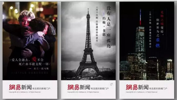 这是在面对「巴黎恐怖袭击」这样的大事件时,网易新闻做出的响应之一。以人文关怀的角度,去传递产品的品牌形象。