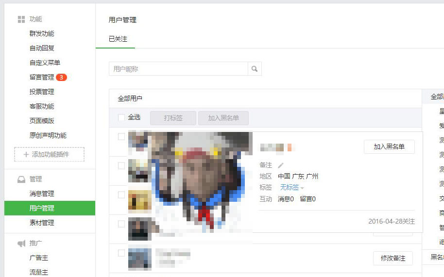 包括备注、地区、标签以及跟这个公众号互动的信息和留言数量。同时你还能够在右下角看到用户添加关注公众号的日期。最后是左上角有一个“加入黑名单”的按钮。