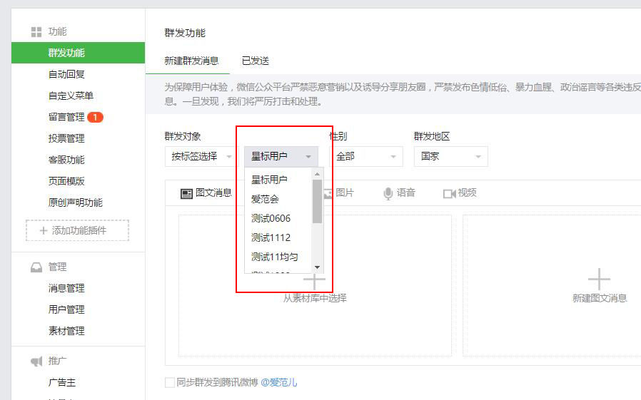 在群发功能的页面,原来的群发对象中出现了一个全新的选项——“按标签选择”。这意味着你完全能够对特定的用户群体发送特定的内容。