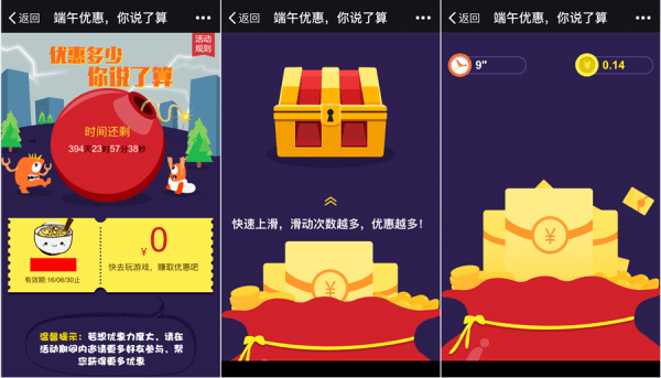 欢天喜地吃粽子:想吃到美味的粽子?瞅准小哥的移动位置,发射“粽弹”。吃到粽子越多,得分越高,获得奖品的机会就越大。