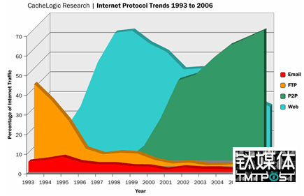 P2P 在诞生后迅速流行,成为互联网流量最大来源之一 来源:torrentfreak