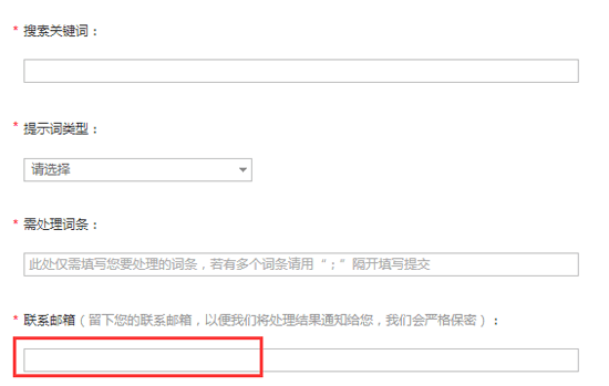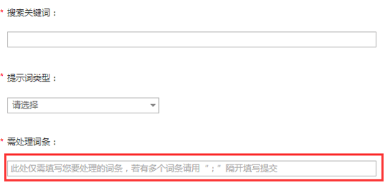 这一部分主要填写用户在百度搜索框查询某一个关键词时会有下拉推荐和页面下方的相关搜索推荐负面词的查询词,注意这里是查询词。