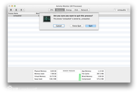 方法一:打开活动监视器,找到coreaudiod,结束之。这个方法是重新启动音频服务。