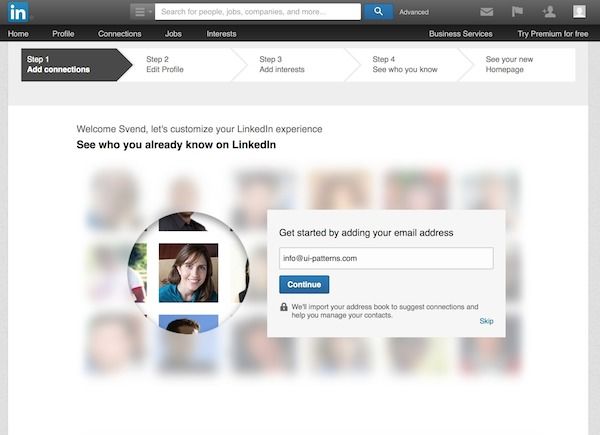 下面的例子来自LinkedIn,结合表单引导和进度条是个很不错的策略,改善了体验的步调。创建一套专业档案所需的冗长过程被分为4个可掌控的步骤。用户也能看到它们的进度到了什么地步,这会激励他们继续进行。步调与效率关系不大,更多是用户是否对体验感到舒适——不会使他们负担过重,也不会减慢它们的速度。