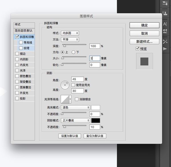 按住Option(Alt)+ 鼠标左键拖动图层往下拽,或者Command(Ctrl)+J,选下面的一个图层,双击图层进入图层样式,选择斜面和浮雕,设置一下参数:
