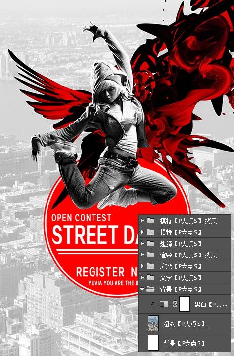 作者的原话:我尝试使用翅膀符号、飞鸟图案和街头舞者相结合,表现一种自由的精神。我使用了红色,以及强烈反差的黑色和白色,并在最后一步添加了一点镜头光晕,因为我认为它可以使图片显得更加时尚和清爽。