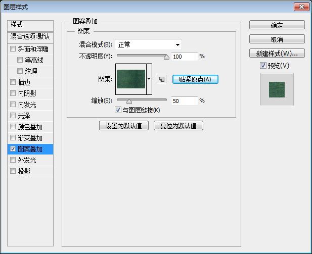 ④给这个图层填充图案,打开图层样式-图案叠加,选择刚才添加的图案,其他参数如下图。每次使用这个图案,不要忘记点一下贴紧原点哦。