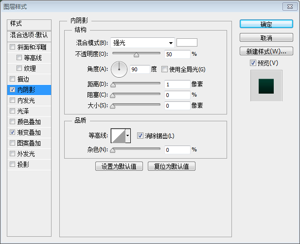 ⑤为了让中央部分显得比较亮,需要调节图层样式-内阴影,参数如下,其中的色值为#0e323b。