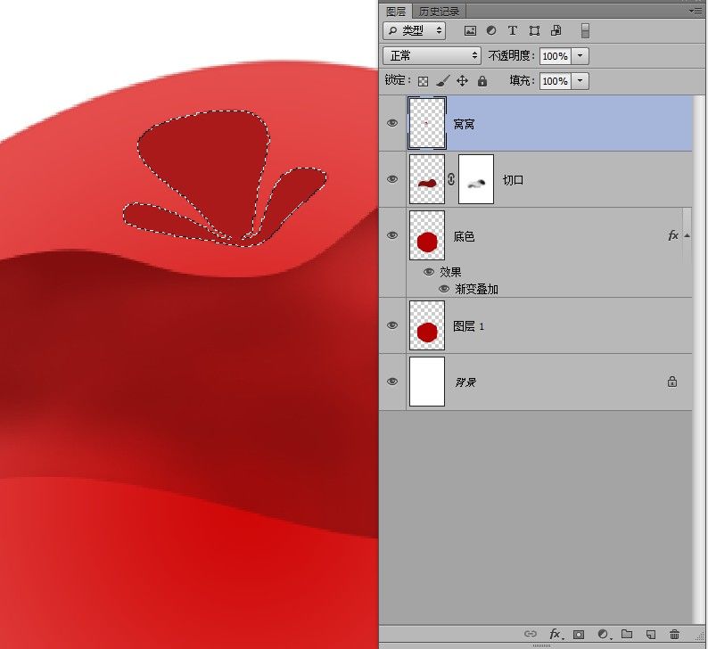 新建一个图层,命名窝窝(我也不知道那个学名叫什么,谁科普一下)用钢笔画出这个形状的路径,转为选区羽化0.5像素,填充#AA1A1A