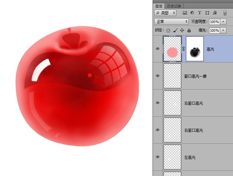 利用钢笔绘制图形,并且用渐变颜色填充形状,和蒙板局部擦除,添加高光,制作有质感的水晶效果的樱桃。