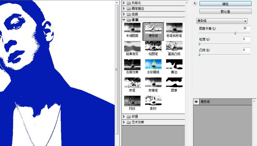 然后菜单—-滤镜—–素描—-便条纸,参数如下。