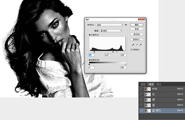 首先,笔者进入通道面板,查看哪个通道下图片的黑白最为分明,也就是头发同背景色关系区别最大的那个通道。选好通道后,将该通道复制一层。选中复制的通道层,然后打开【图像>调整>色阶】命令,移动滑块使得黑色变更黑、白色更白。