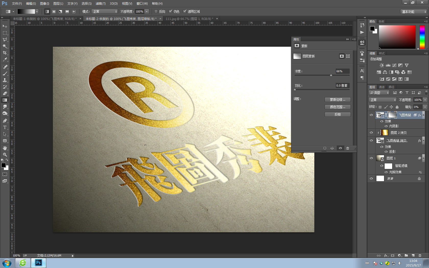 添加蒙版,拉一个黑白渐变。我想让靠近光源的内阴影的透明度稍微低一点,符合现实生活中的实际情况,但是也不能一点也没有,所有我把蒙版透明度再减低一些。