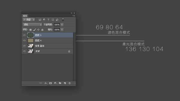 然后再新建一个图层,填充色彩R69 G80 B64,混合模式改为滤色