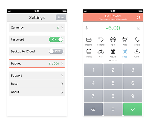 回到此前思考的第二个问题,我记账的目的是为了 “了解我的财务状况” 。 所以预算功能及与其相关联的提醒功能就变得尤为必要。我设想了一个叫做 “预算” 的功能,当我设置了我每月的预算,并且每月的支出超出我设定的预算以后,那么在首页的记账界面,Titlebar 会变成红色以警示你应该省着点花钱。