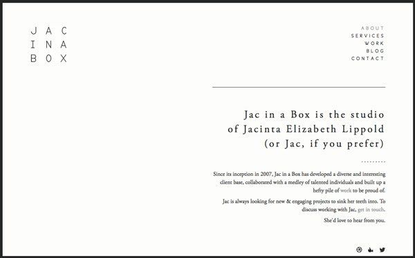 Jac in a Box:留白在此处的运用是如此抢眼,因为它真的很大面积。将的视线从logo(本身的留白就运用非常完美)吸引到另一个角落的主体文字上。