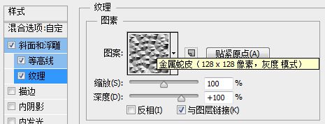 勾选“纹理”选项,这个纹理图案就是刚才的那个“金属蛇皮”图案。