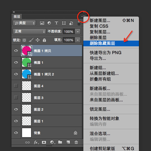 点击图层面板右上角展开菜单,选择【删除隐藏图层】,这样软件会自动删除所有的隐藏的图层了。