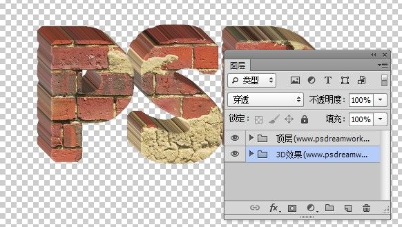将砖纹理图层与亮度/对比度图层按Ctrl+E合并。安装素材中的3D生成动作,并执行,得到下图效果。