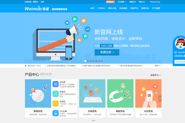 域名城(domain.cn)2月23日消息 今日,国内最大的微信第三方开发服务商微盟上线全新官网。新上线的官网包括微电商整体解决方案、智慧餐厅解决方案、智慧城市解决方案和移动办公解决方案等模块,布局上也由原来单一的微信第三方服务拓展到移动社交电商平台、O2O、移动办公以及移动社交广告等多个领域,这意味着,微盟实现战略转型升级,变身为微信营销领导者。