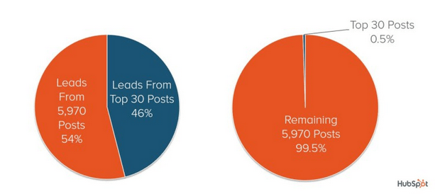 据hubspot的调查数据显示,在一个SEO网站发布的6000篇文章中,浏览量靠前的30篇文章占据了全站流量的46%,而剩下的5970篇文章带来的自然流量仅为54%。