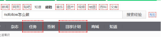 最后,我们不仅可以在网站首页做nofollow,还可以在网站任何页面做。譬如栏目页面的其他导航或分类名称,在或者内容页里面的一些导出链接等,都可以做处理。我们可以在看一个案例,是百度知道和百度经验内容页的nofollow处理: