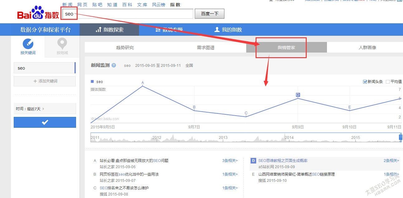 热点趋势:这个曲线图显示的是seo这个关键词的每天的搜索数量。再结合上图(红色方框),就可以知道一些关键词是刷出来的还是真实的搜索数据,操作方法是往左拉动图片标注红色那个东西,可以看见近几年的历史数据,如果上面的曲线图有高有低就表示不是刷的,如果前面是平线,突然有了搜索量就表示是刷出来的指数。