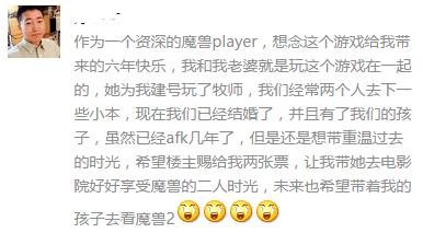 魔兽的老玩家可谓是花招百出,各种游戏梗津津乐道,求票技能也是轻车熟路,然而就在我们以为非魔兽玩家完全没有得票机会的时候,一位【魔兽女友】在留言中发布了一段让小编都颇为感概的留言:“之前收到老公邀请一起看魔兽,随口答应没在意那么多,直到看到你们这个文章,才忽然明白一个男生约你看魔兽不仅仅是要带你看一场电影,而是让你和他一起回忆他所有的青春。”