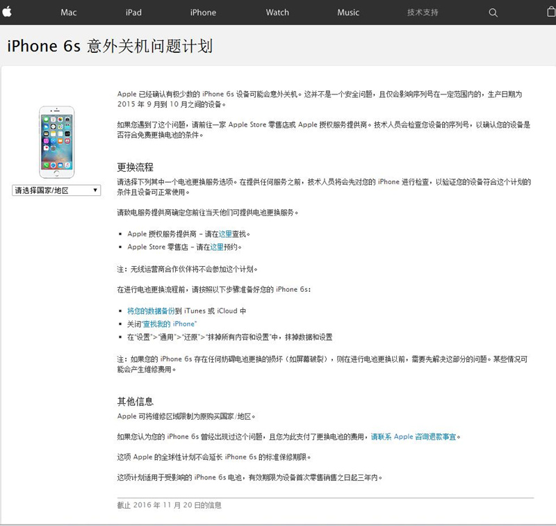 11月20日,苹果公司就“iPhone自动关机”一事,在官方网站对外发布声明,Apple 已经确认有极少数的 iPhone 6s 设备可能会意外关机。这并不是一个安全问题,且仅会影响序列号在一定范围内的,生产日期为2015年9月到10月之间的设备。遇到此问题且符合条件的用户,可免费更换电池。