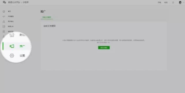 开发者可在微信小程序后台的 “推广” 模块中,配置与小程序业务相关的关键词。关键词在配置生效后,会和小程序的服务质量、用户使用情况、关键词相关性等因素,共同影响搜索结果。