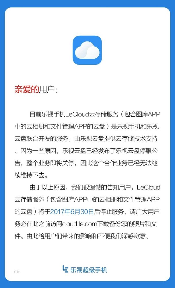 在乐视云盘宣布停服之后,乐视@超级手机 官方微博也发布公告,宣布乐视手机LeCloud云存储服务即将在2017年6月30日之前停止服务,请用户在此日期之前对相册和文件进行备份。