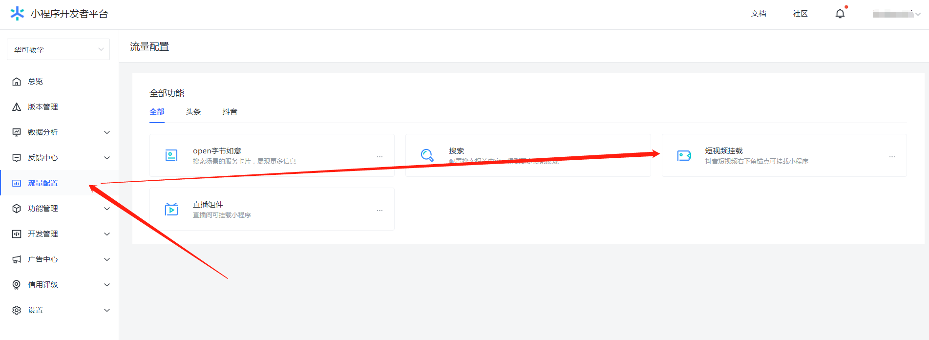 1.1 登录字节小程序开发者平台,点击“流量配置”选择“短视频挂载”,平台会自动判断是否满足申请挂载条件,申请成功后才可以设置视频挂载小程序。
